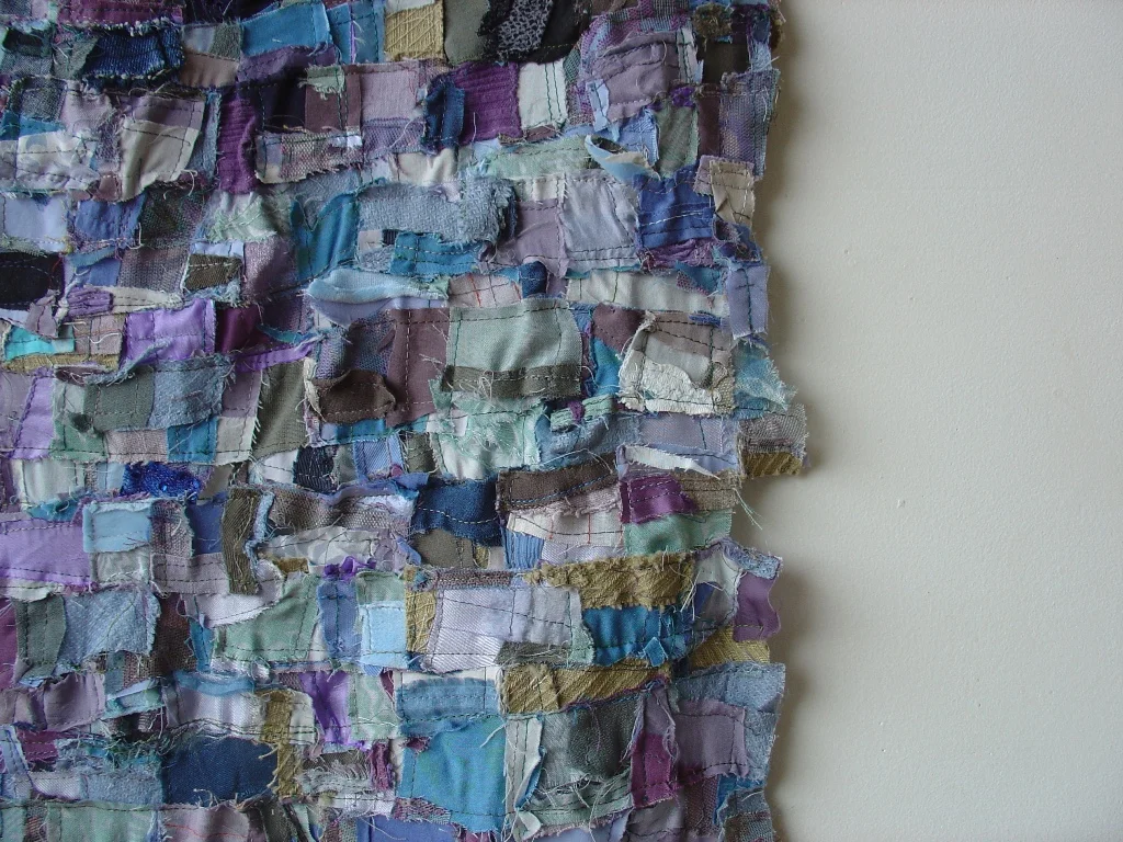 Dans cette œuvre continue je m’inspire des techniques traditionnelles de courtepointes et d’imagerie minimaliste pour créer une texture maximaliste. Tissus et vêtements recyclés sont cousus ensemble avant d’être à maintes reprises tailladés et recousus, fracturant et dispersant chaque pièce dans le champ graphique, un processus qui réunit à la fois la beauté et l’absurdité de la répétition.